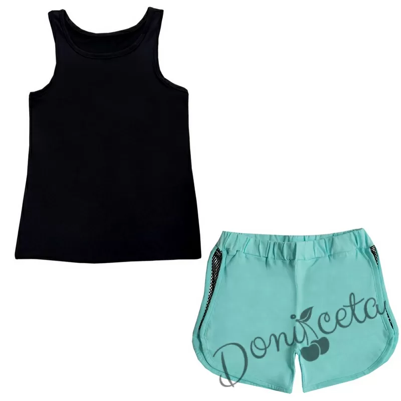 Детски комплект от потник в черно и къси панталонки в тюркоаз/мента