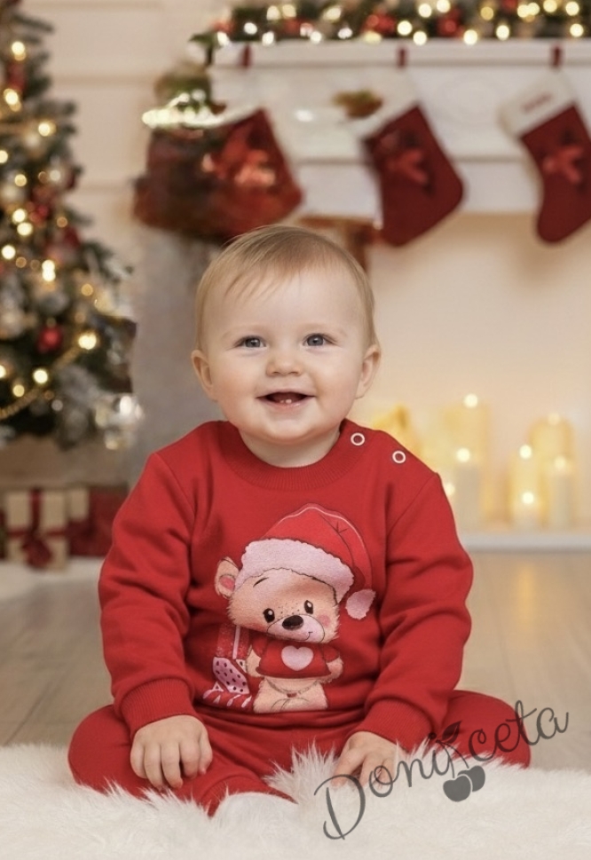 Бебешки коледен комплект с боди, панталонки и шапка с мечок в червено