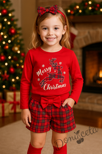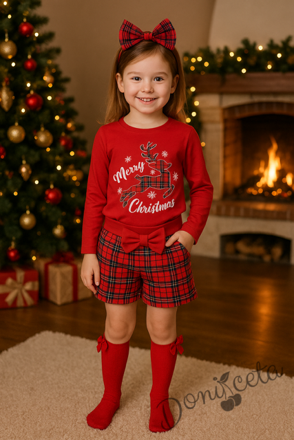 Детски коледен комплект за момиче от пола каре и червена блуза с елен