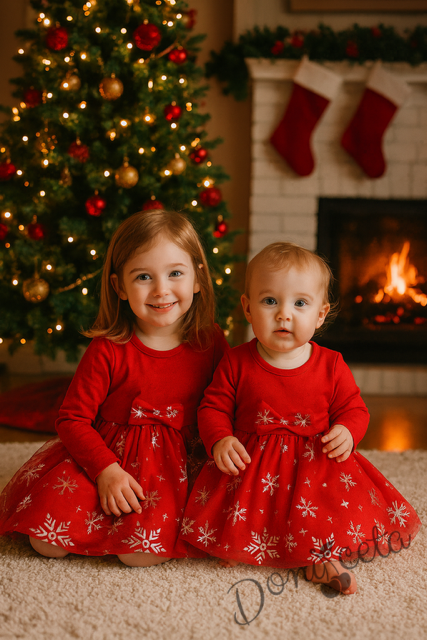 Начало МОМИЧЕТА Детска коледна рокля в червено с панделка със снежинки в сребристо