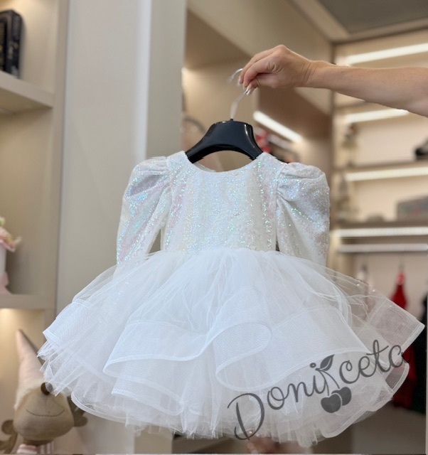 Официална детска къса рокля с дълъг ръкав в бяло с пайети Людмила с фиба за коса от колекция Снежина