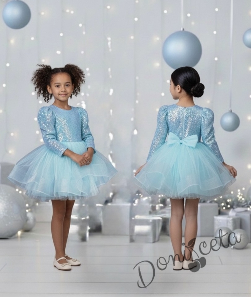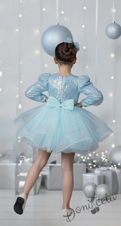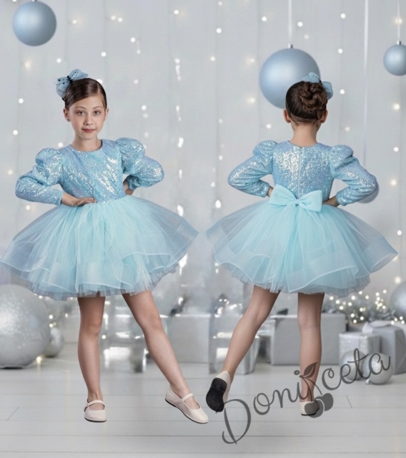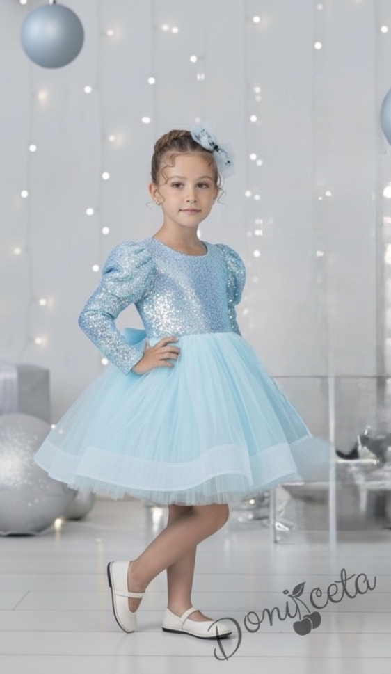 Официална детска къса рокля с дълъг ръкав в светлосиньо с пайети Людмила с панделка за коса от колекция Светлосияна