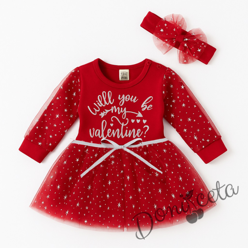 Бебешка коледна рокля с дълъг ръкав в червено с тюл на звездички и подарък лента за глава
