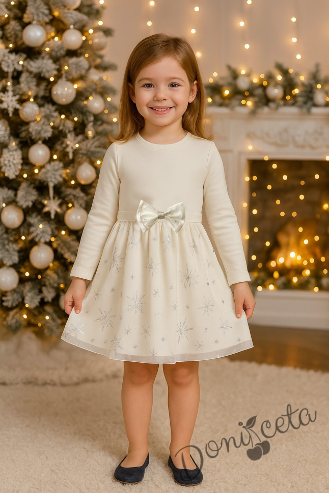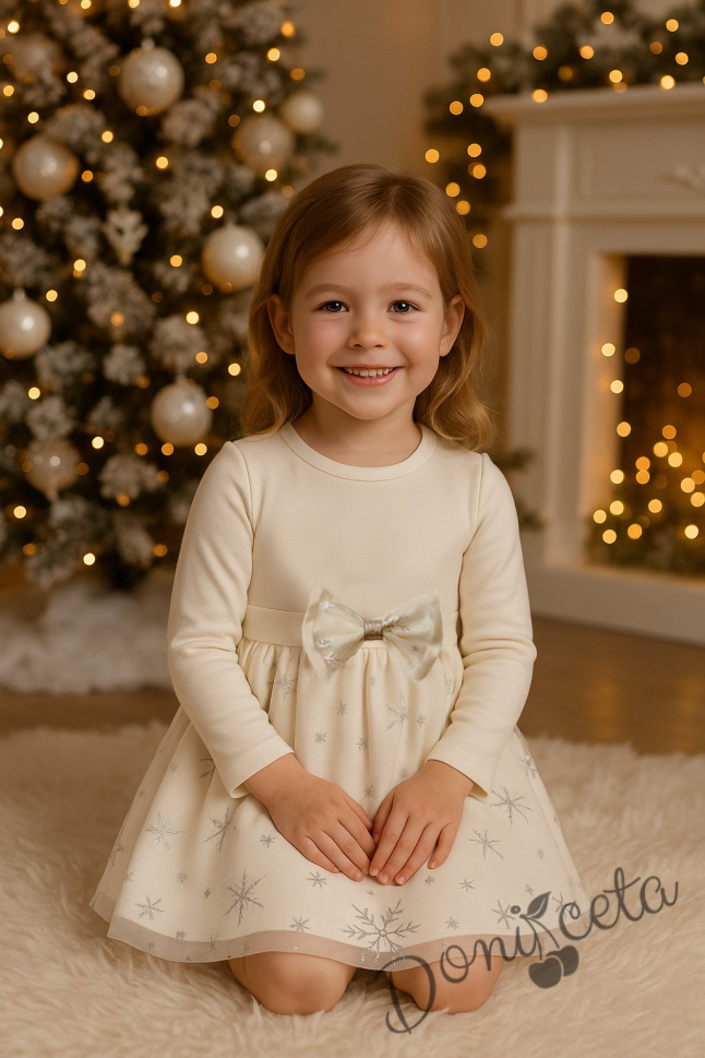 Детска коледна рокля в екрю с панделка със снежинки в сребристо