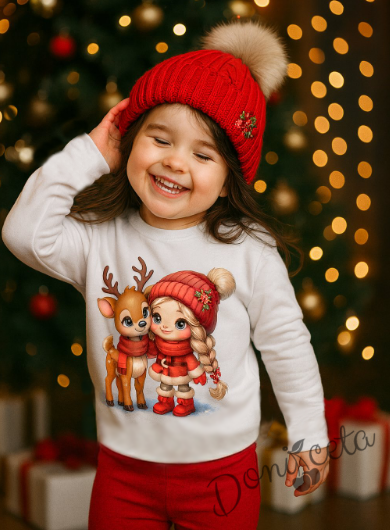 - Много весела коледна блузка в бяло с момиченце и еленче.