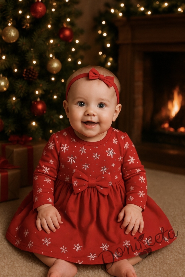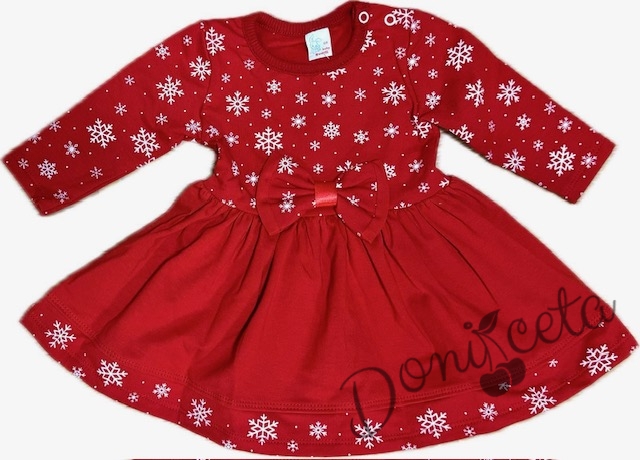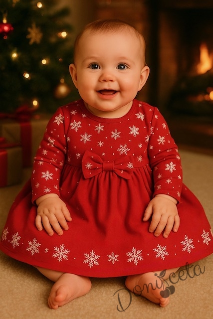 - Бебешка или детска коледна рокличка в червено със снежинки с дълъг ръкав.
