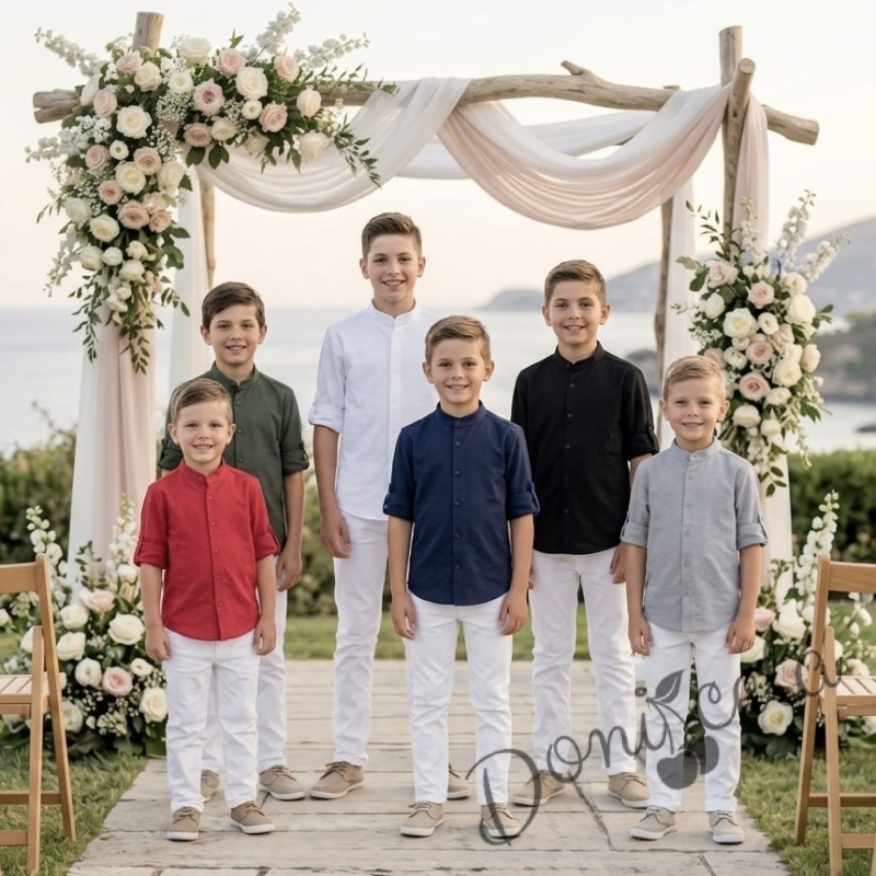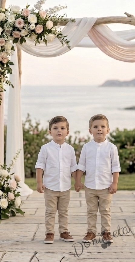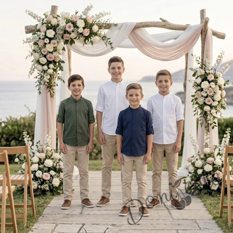 - Официална детска риза с дълъг ръкав за момче в бяло без яка.