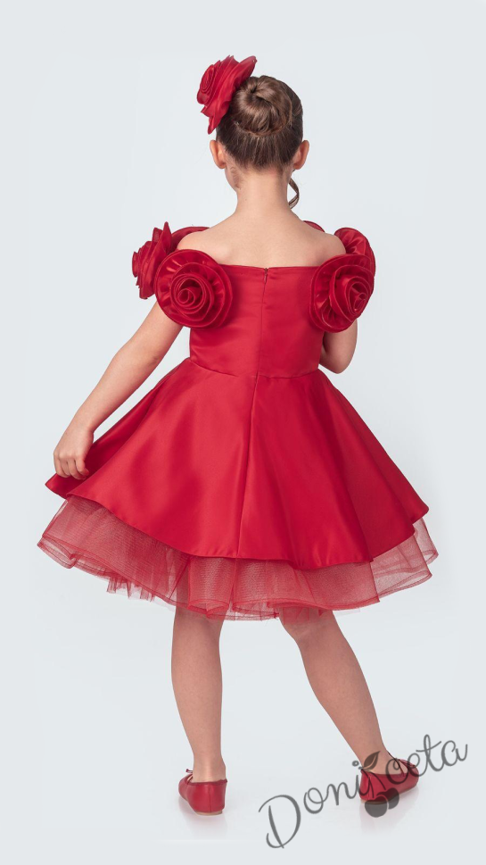 Детска официална рокля в червено от сатен с 3D цветя, тюл и аксесоар за коса Тифани от колекция Червеника
