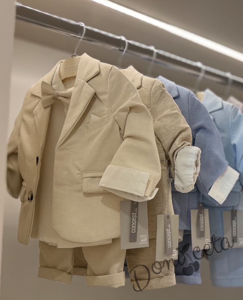 Бебешки комплект за момче от 4 части в бежово - сако, панталон, риза в бяло и папийонка