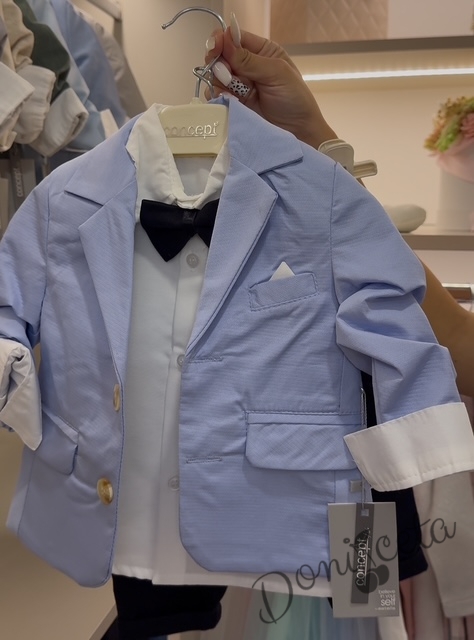Бебешки комплект за момче от 4 части - сако в светлосиньо, панталон в тъмносиньо, риза в бяло и папийонка