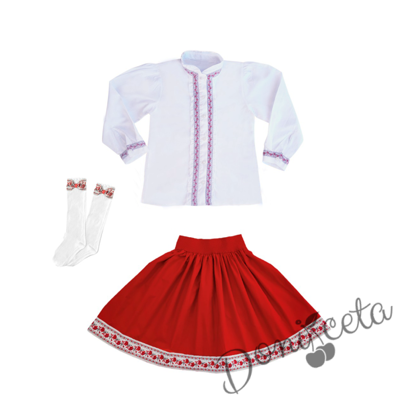 Комплект за момиче от 3 части-пола в червено, риза с дълъг ръкав и къдрици с фолклорни/етно мотиви и чорапи с панделка