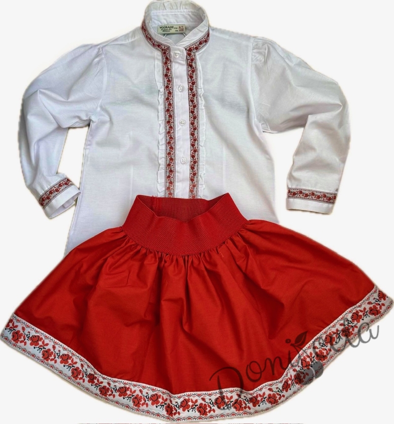 Комплект за момиче от 2 части- пола с етно мотиви и риза в бяло с червени къдрици