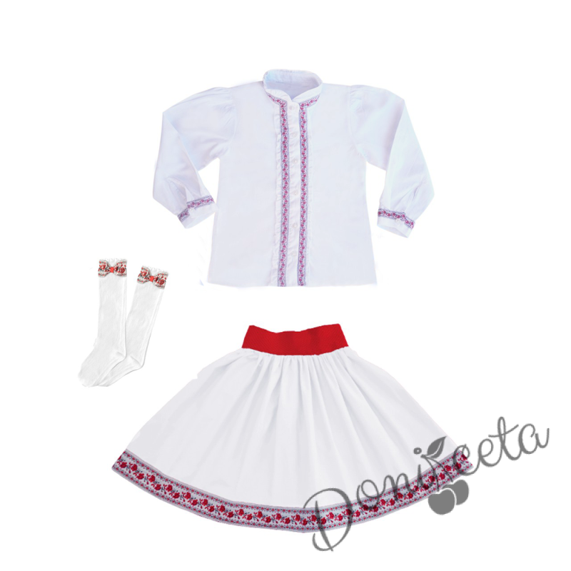 Комплект за момиче от 3 части-пола в бяло, риза с дълъг ръкав и къдрици с фолклорни/етно мотиви и чорапи с панделка