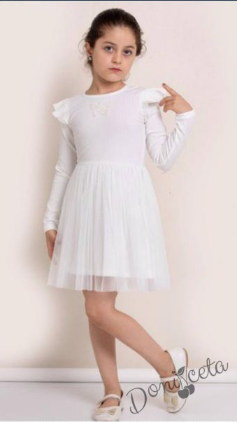 Детска рокля в бяло с дълъг ръкав с пеперуда и тюл