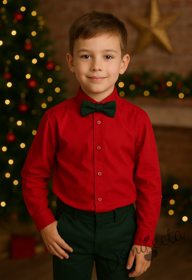 Коледен комплект за момче от 3 части-риза в червено, панталон в зелено и папийонка