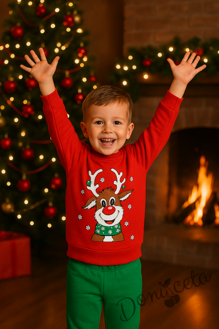 Ватиран коледен детски комплект в червено и зелено с еленче 857773