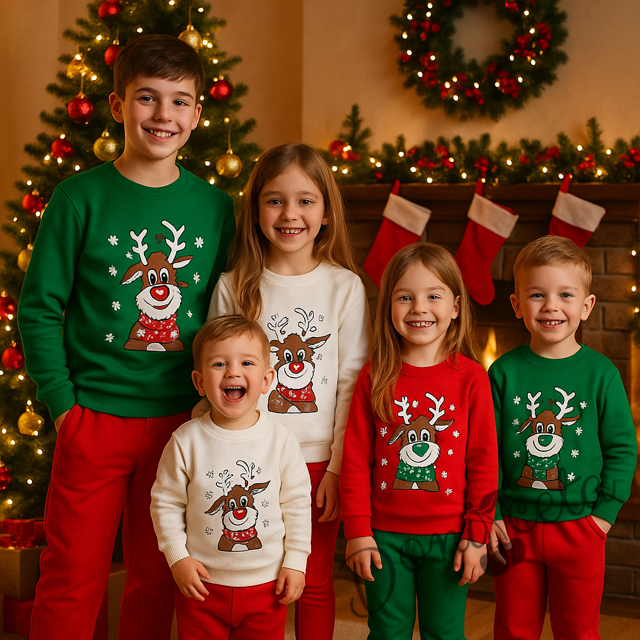 Ватиран коледен детски комплект в червено и зелено с елен 7425364 Звън