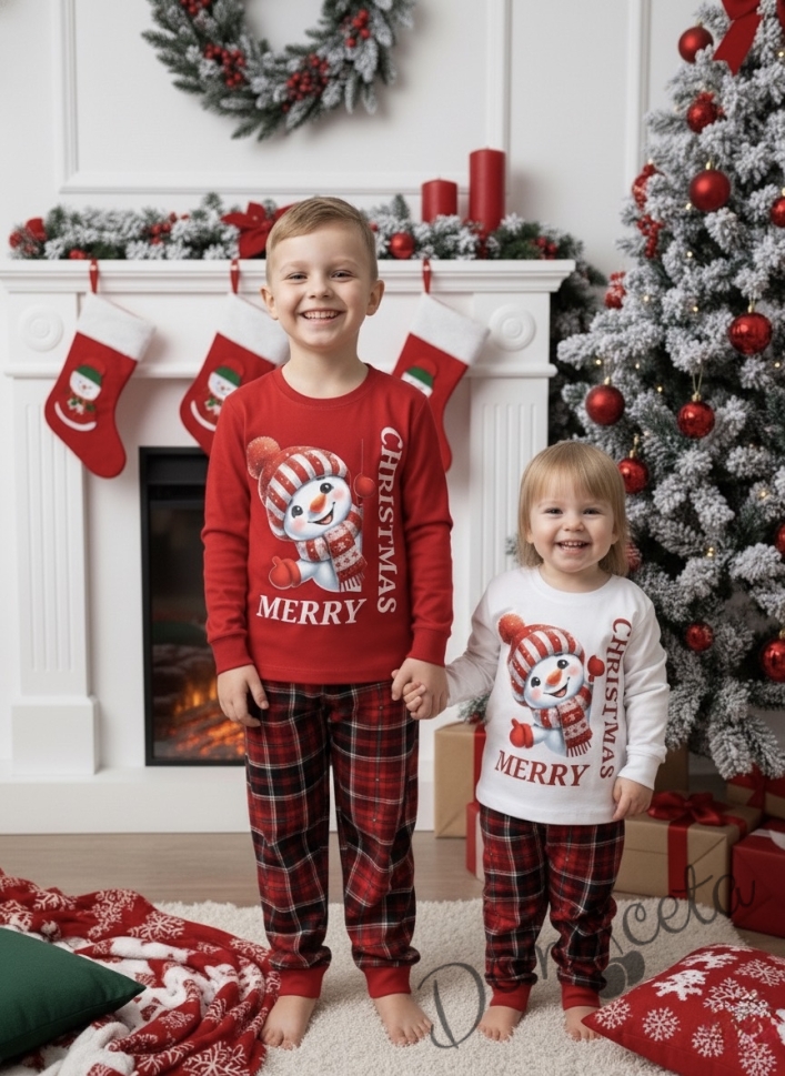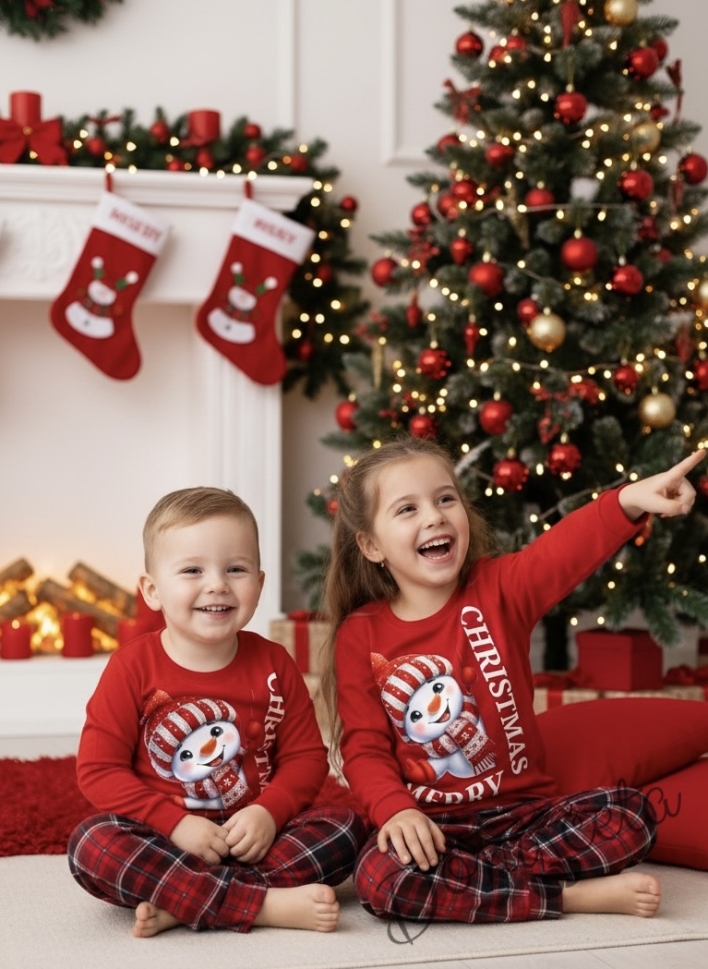 Коледна детска пижама в червено с дълъг ръкав със снежен човек и надпис и долнище в червено каре