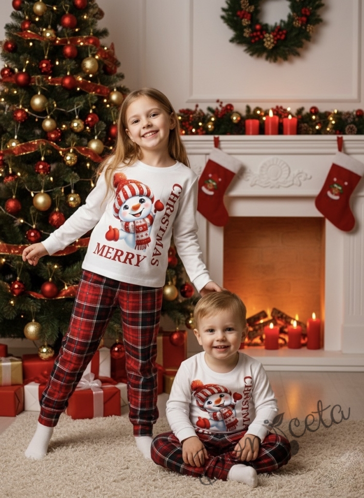 Коледна детска пижама в червено и бяло с дълъг ръкав със снежен човек и надпис и долнище в червено каре