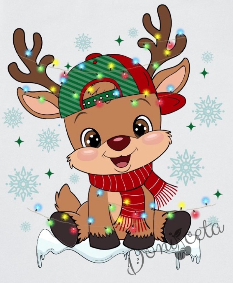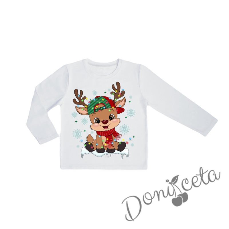 Коледна блуза в бяло с дълъг ръкав и картинка на еленче