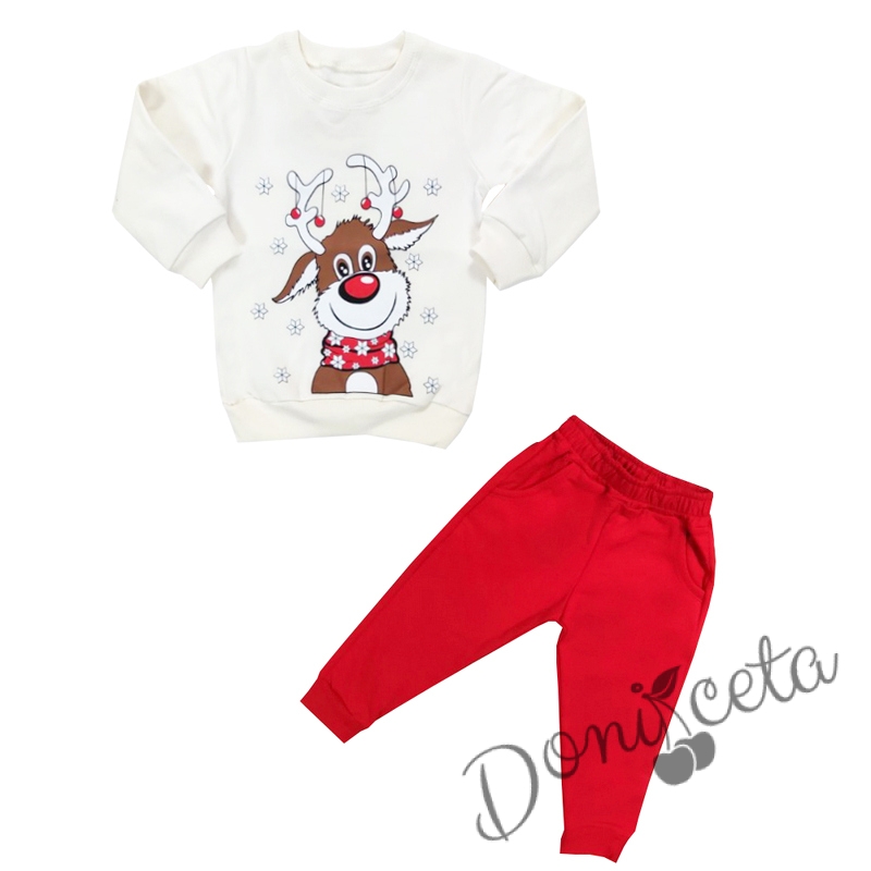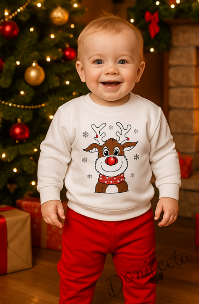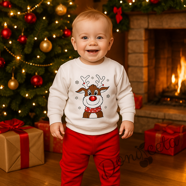- Топъл и удобен весел бебешки/детски комплект от блузка в бяло с елен и панталонки в червено.