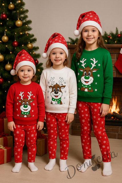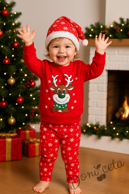 Коледен ватиран комплект в червено с картинка на елен с коледна шапка