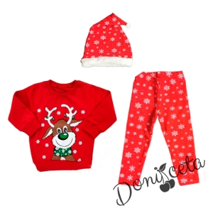 Коледен весел комплект в червено от блуза с еленче, клинче и шапка на снежинки Звън