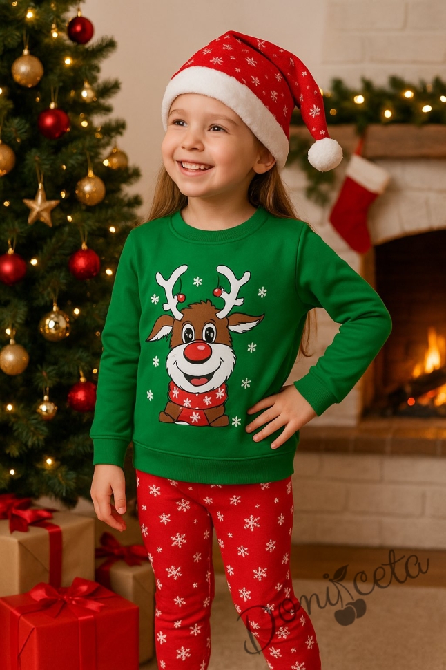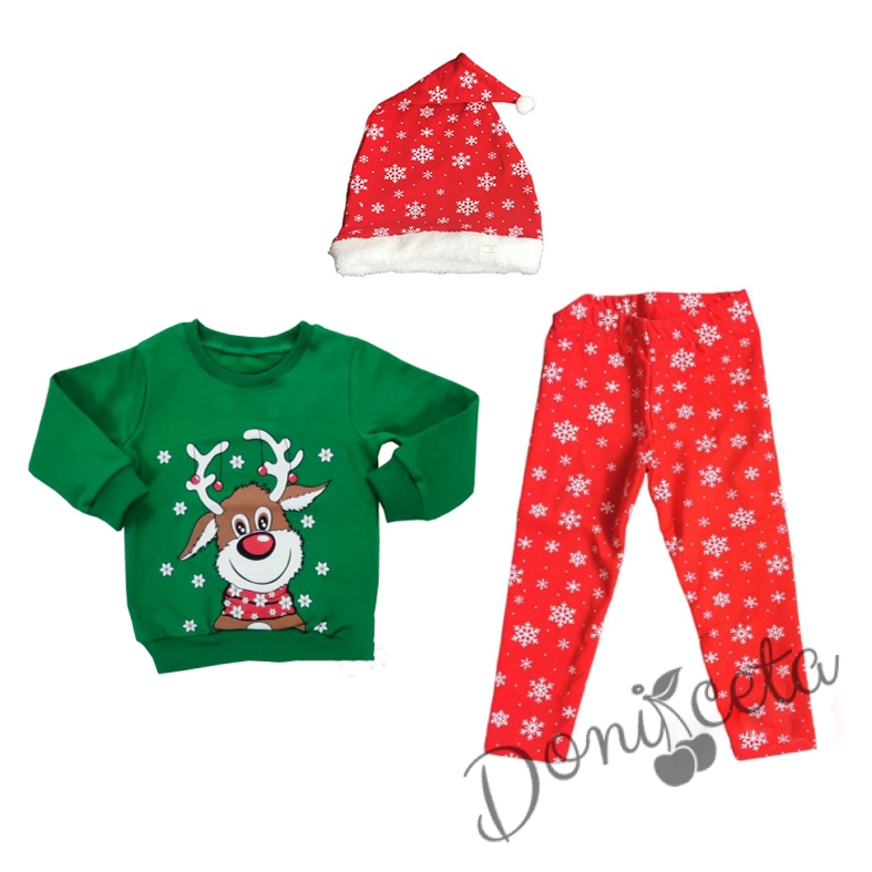 Коледен комплект в зелено с картинка на еленче с коледна шапка
