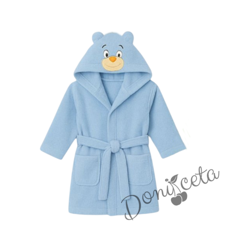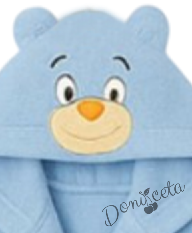 Детски халат за баня с качулка с мече и джобчета в светлосиньо