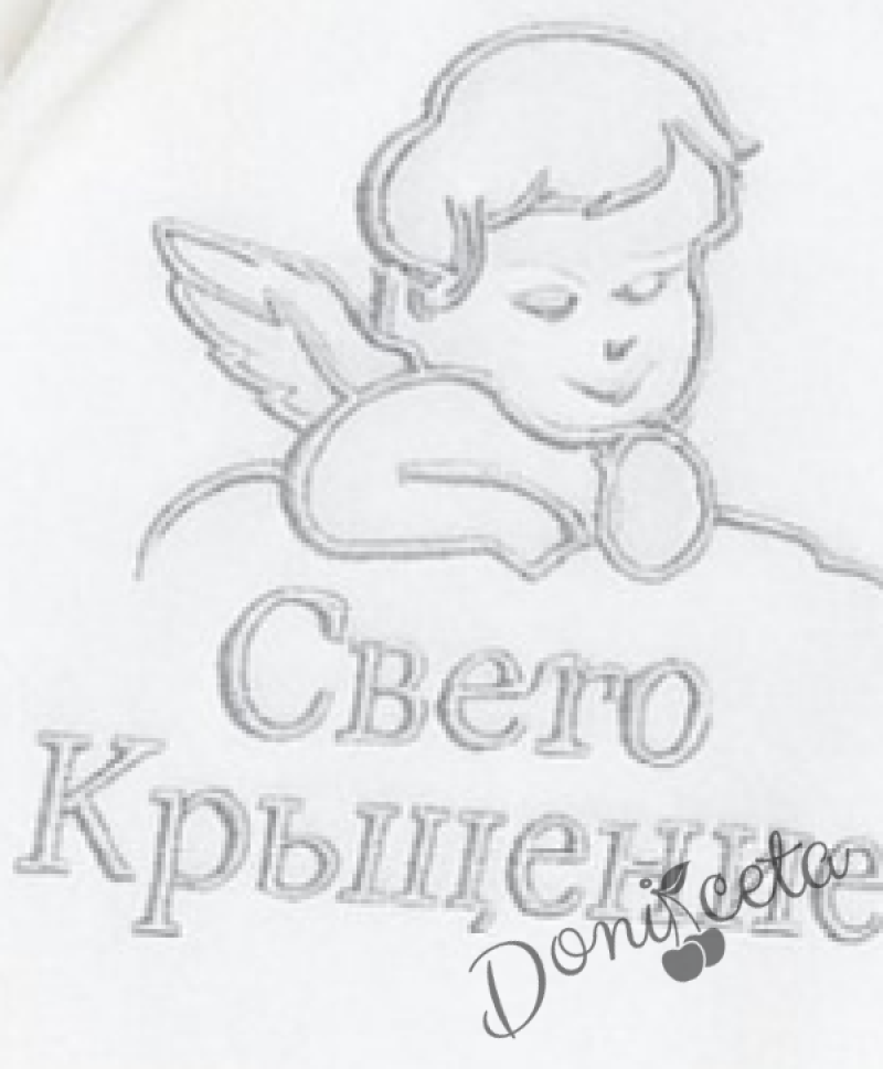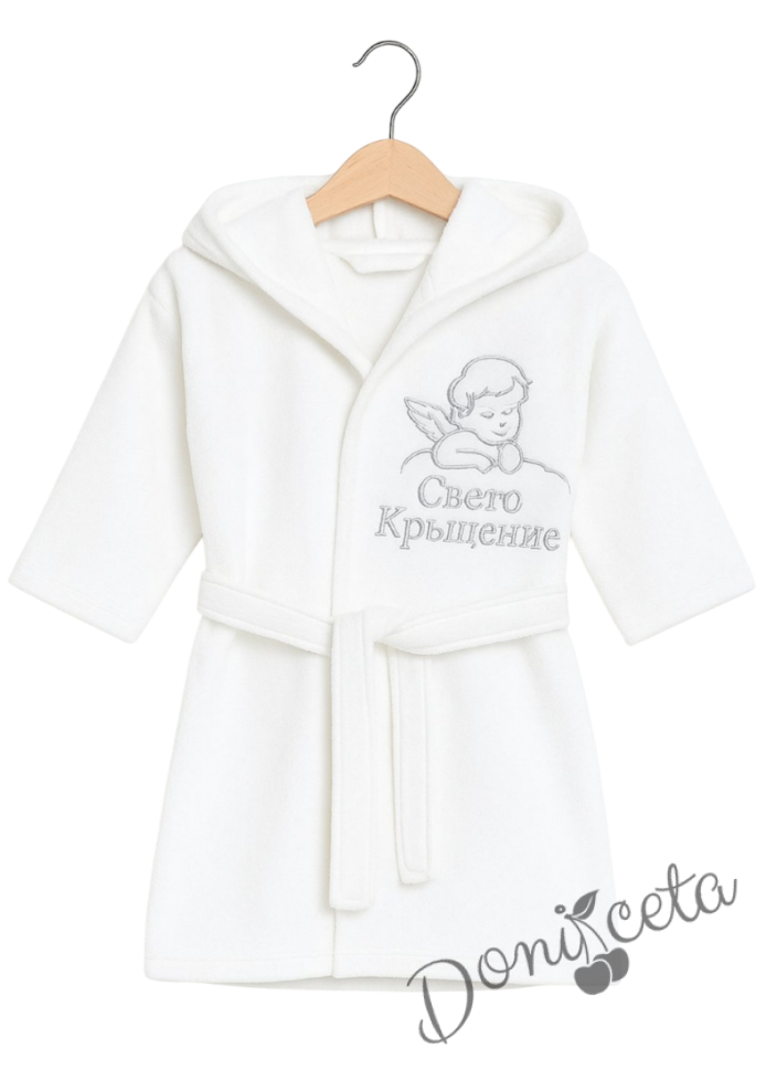 Детски халат за кръщене в бяло с качулка и надпис Свето Кръщение