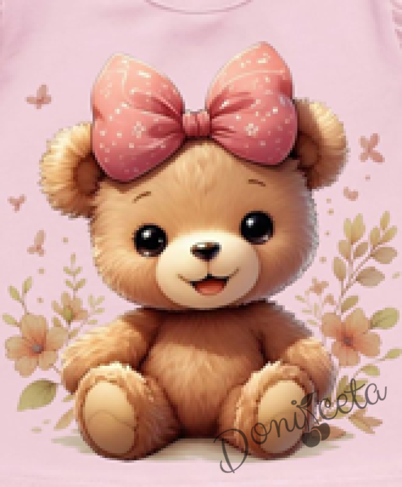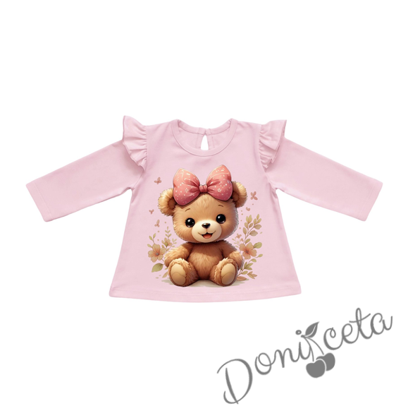 Детска блуза с дълъг ръкав в розово с къдрици и картинка на мече