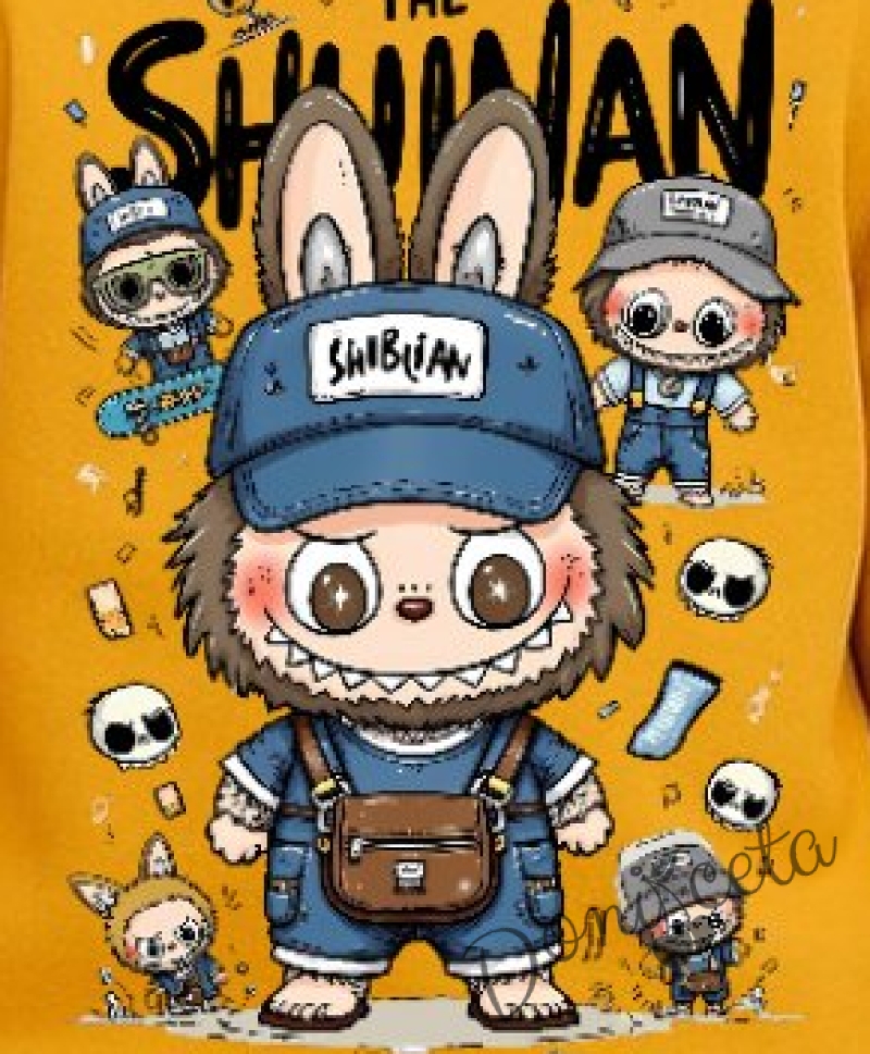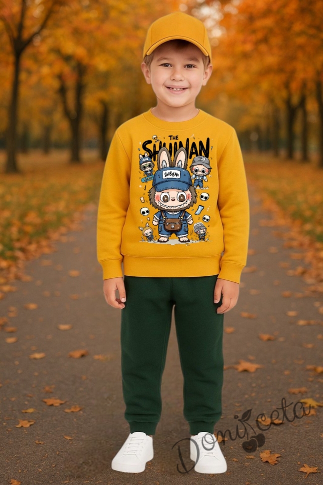 Детски ватиран комплект за момче от блуза в жълто с картинка на Лабубу и долнище в зелено