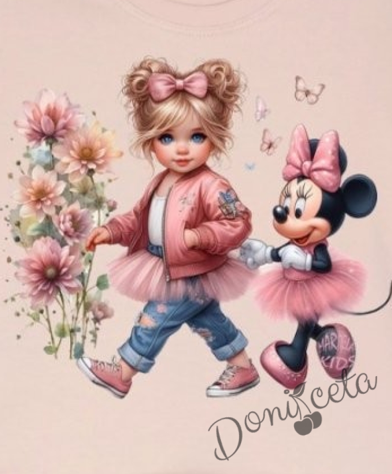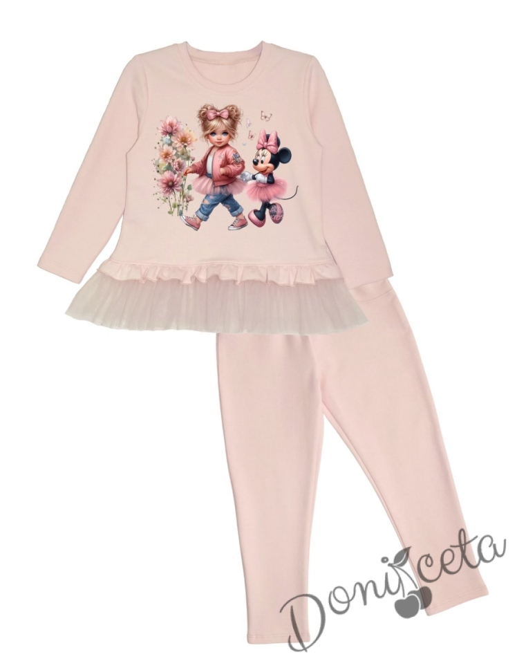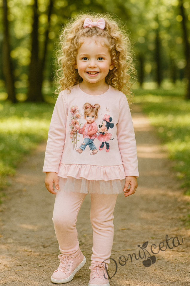 - Детски комплект за момиче от 2 части в цвят пудра - блуза със сладка картинка на момиченце и Мини Маус, с къдрички и тюл в долната част и клин.