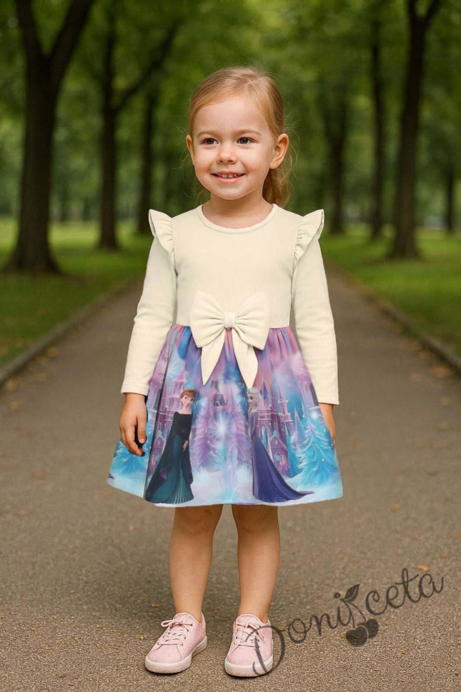 Детска рокля с дълъг ръкав в екрю с къдрички, картинка с Елза и Анна и панделка