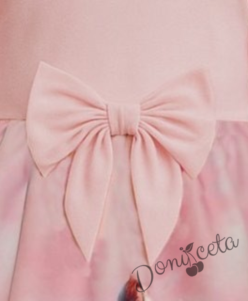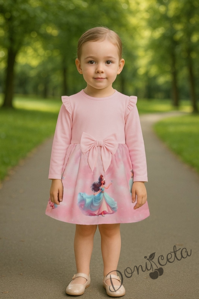 Детска рокля с дълъг ръкав в розово с къдрички, панделка и картинка с принцеса