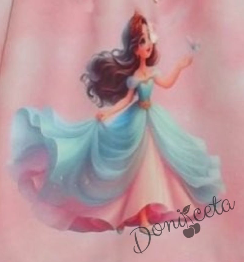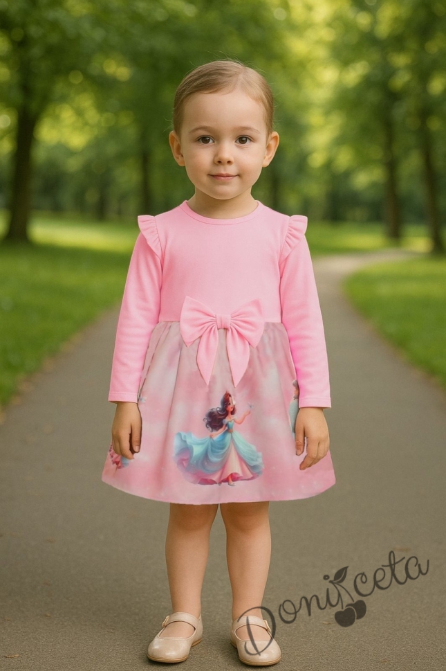 Детска рокля с дълъг ръкав в тъмнорозово с къдрички, панделка и картинка с принцеса