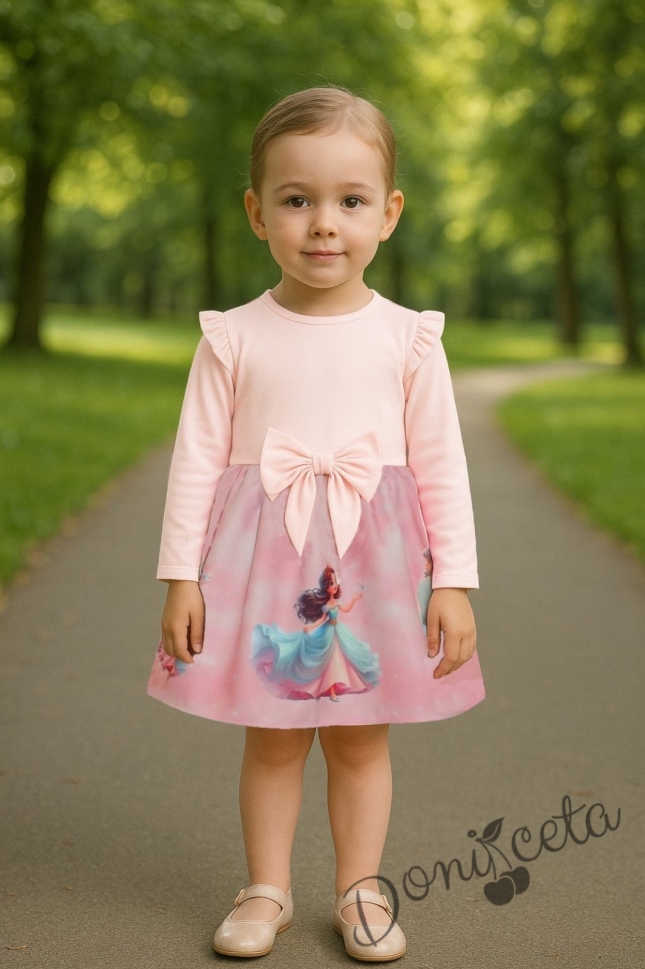 Детска рокля с дълъг ръкав в светлорозово с къдрички, панделка и картинка с принцеса