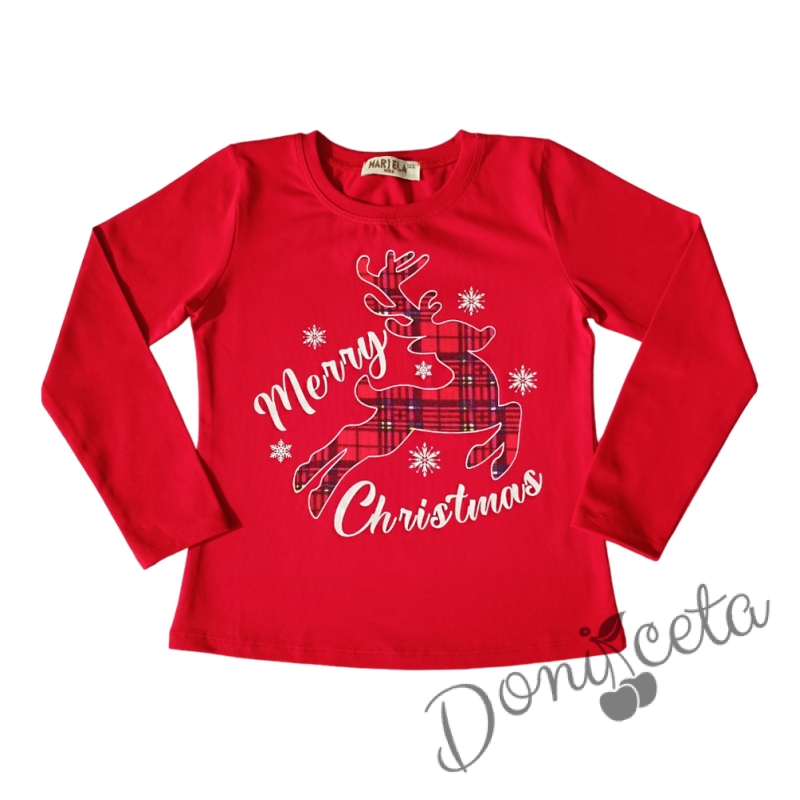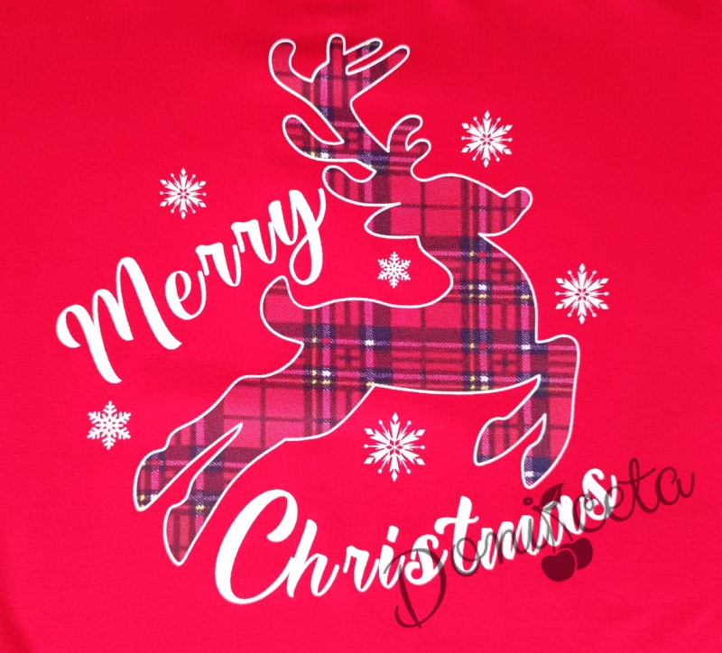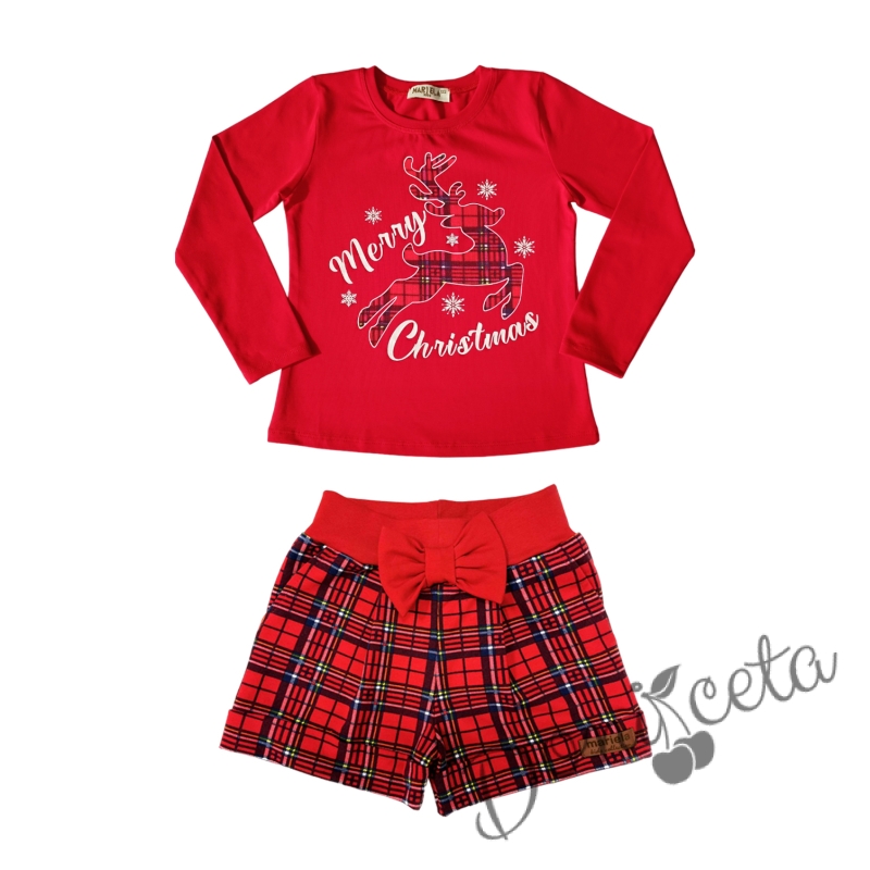 - Модерен комплект за момиче от къси карирани панталонки в червено и блуза с дълъг ръкав в червено с коледна картинка на еленче с надпис "Merry Christmas".