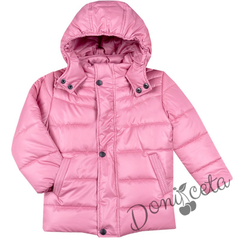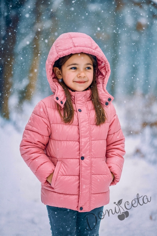 Детско зимно яке за момиче с качулка в бонбонено розово