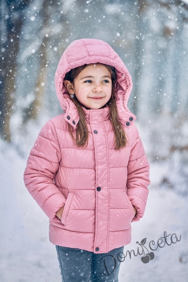 Детско зимно яке за момиче с качулка в светлорозово