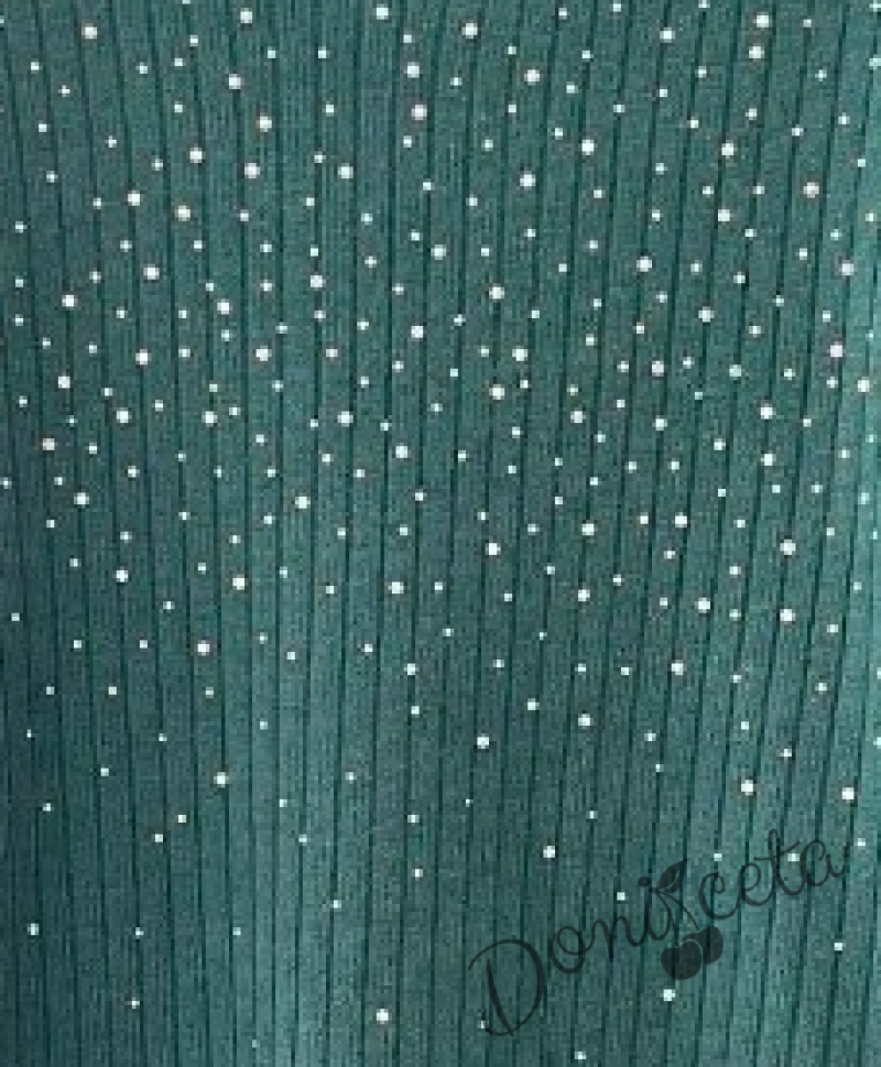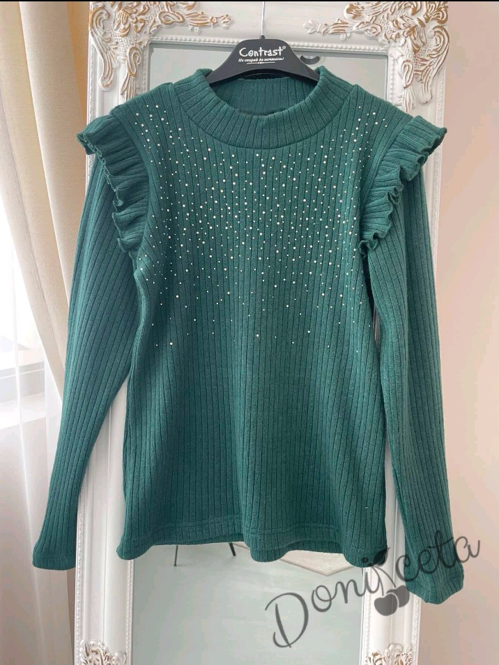 Блуза с дълъг ръкав за момиче в зелено с къдрички и блестящи камъчета