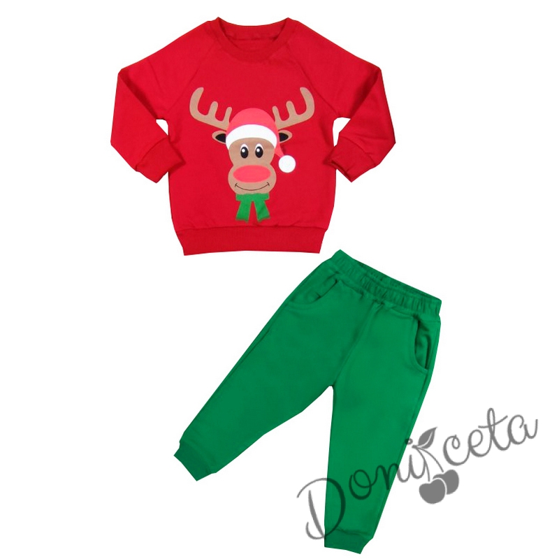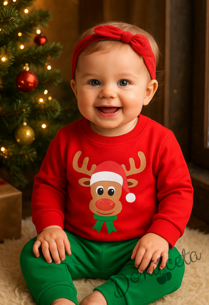 Ватиран бебешки коледен детски комплект в червено и зелено с елен