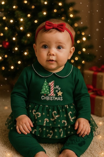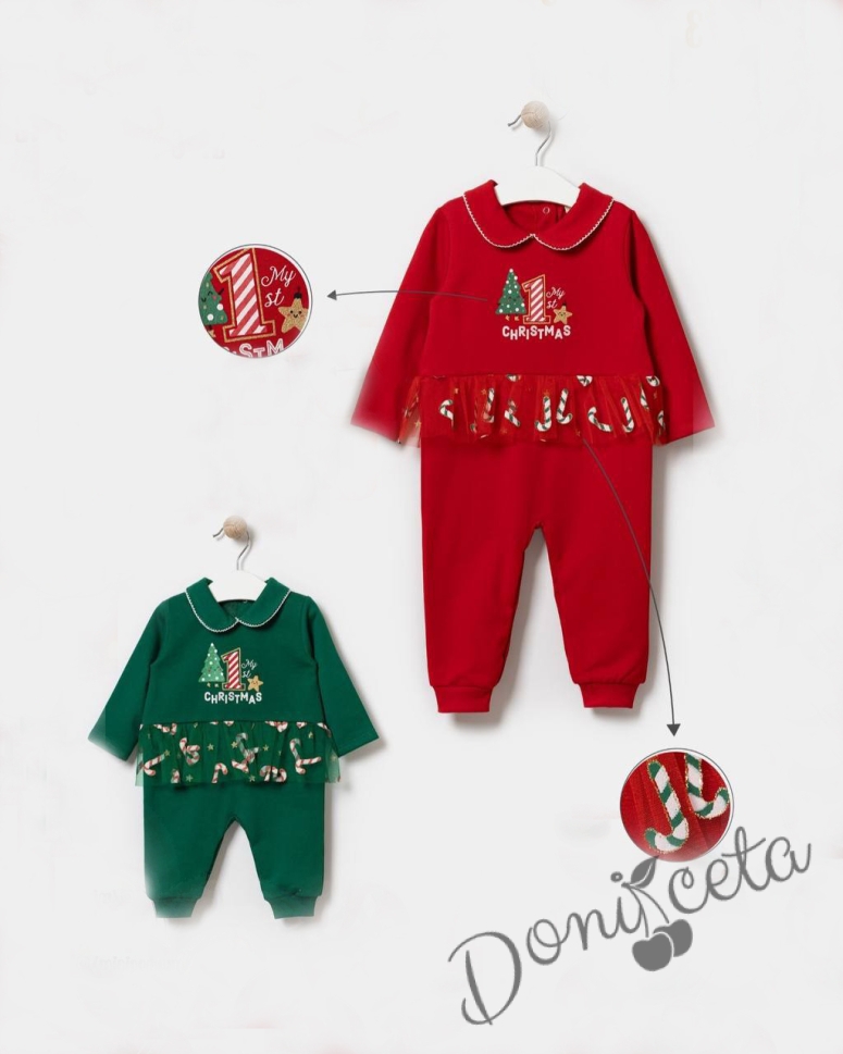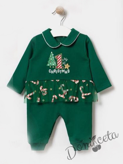 Бебешки коледен гащеризон за момиче в зелено с коледни мотиви и тюл на кръста с близалки