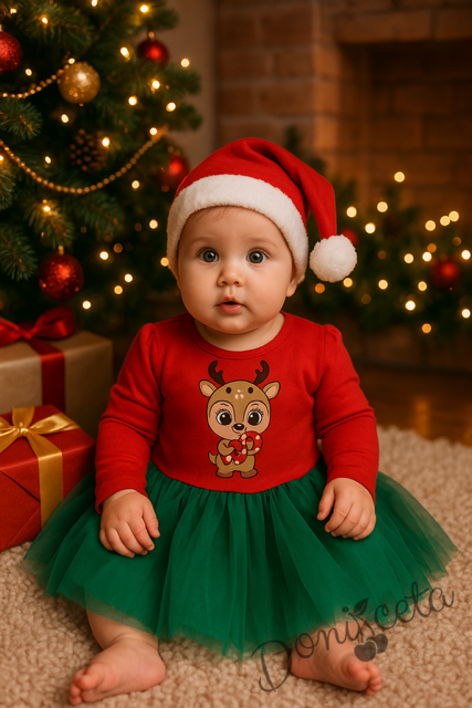 Начало МОМИЧЕТА Коледна бебешка ватирана детска рокля с дълъг ръкав в червено и зелено с еленче