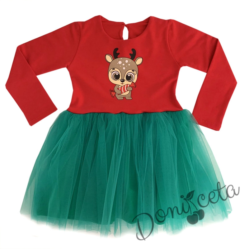 Коледна бебешка ватирана детска рокля с дълъг ръкав в червено и зелено с еленче