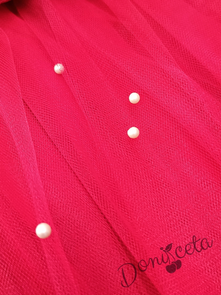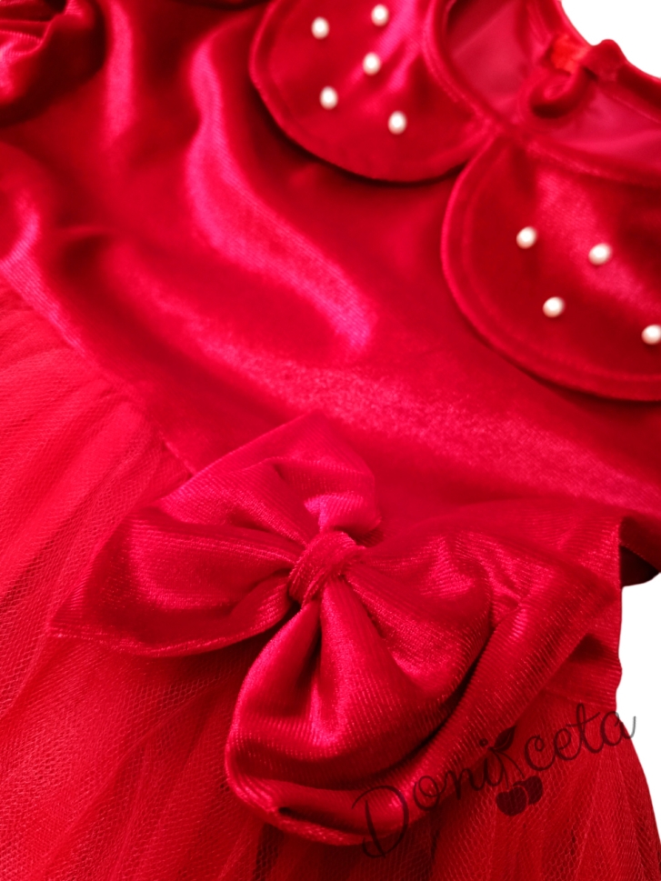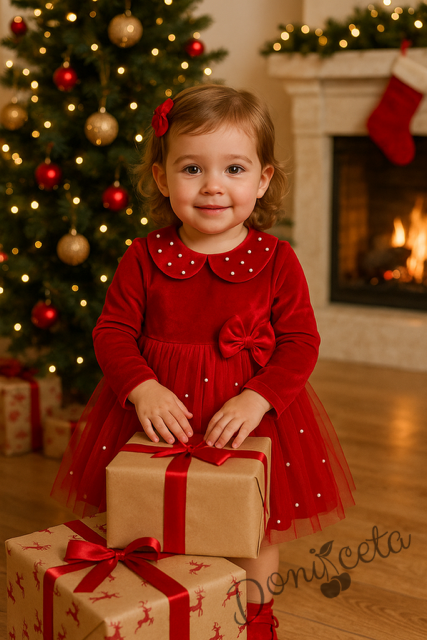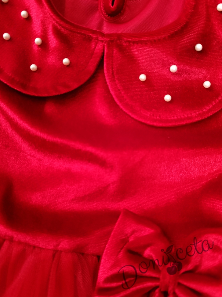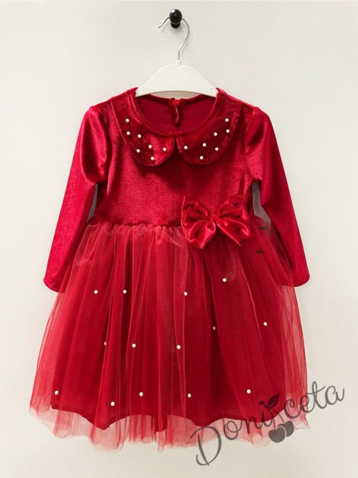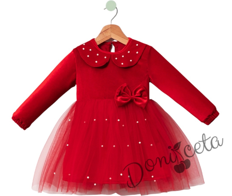 Детска коледна рокля в червено с дълъг ръкав, тюл и якичка с перли