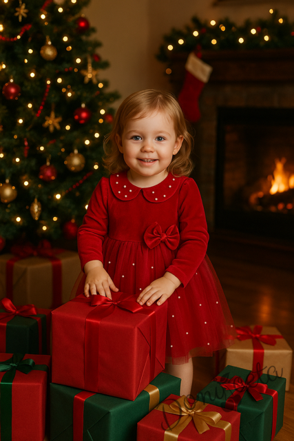 Коледна детска права рокля с дълъг ръкав с картинка на момиченце и елек в червено