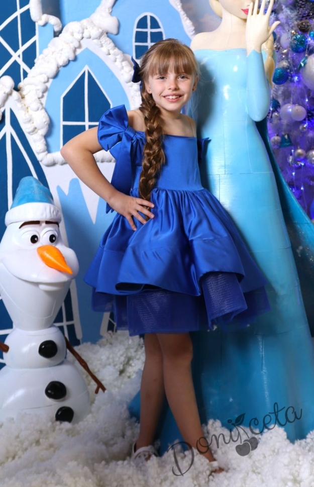 - Роклята е от тюл и сатен в наситен син цвят и към нея има подходяща фиба за коса във форма на панделка от сатен в синьо.