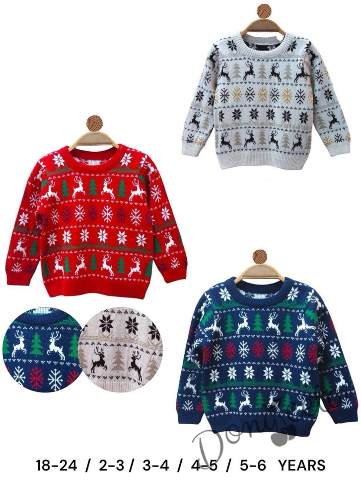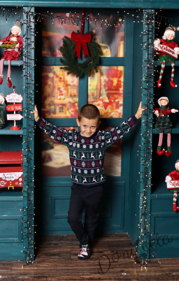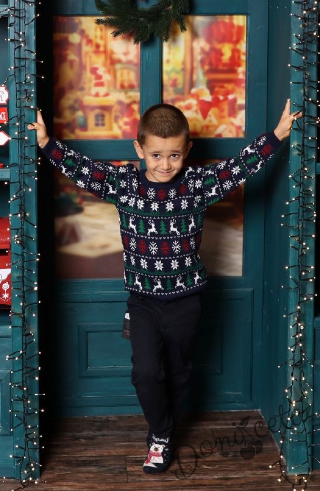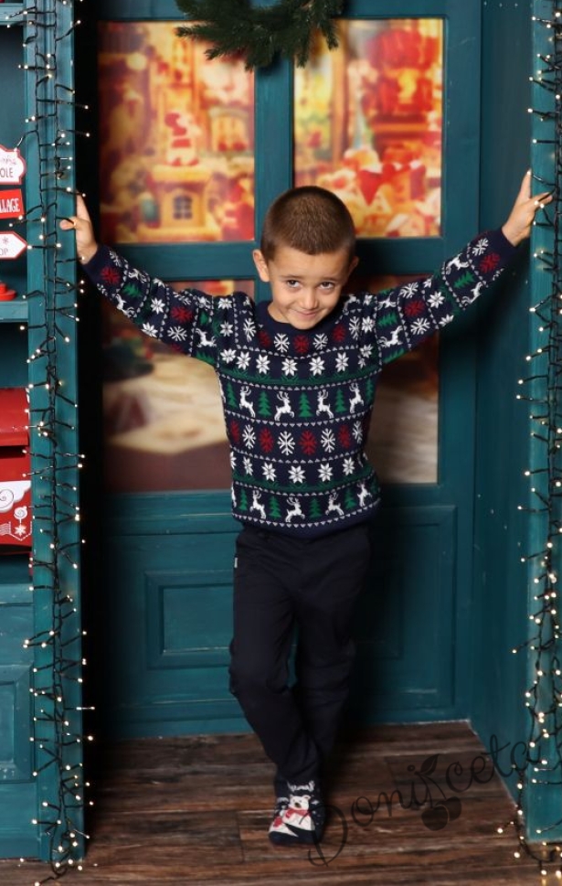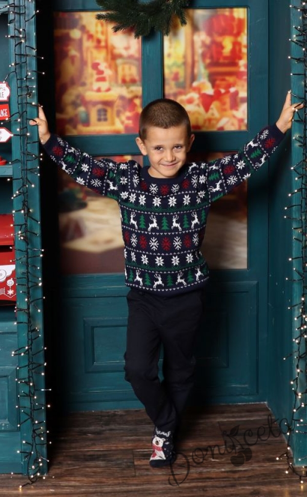 Начало МОМЧЕТА Коледен пуловер за момче или момиче в тъмносиньо с еленчета и елхички