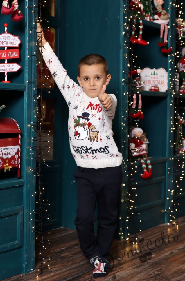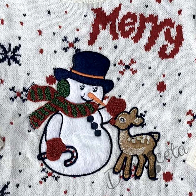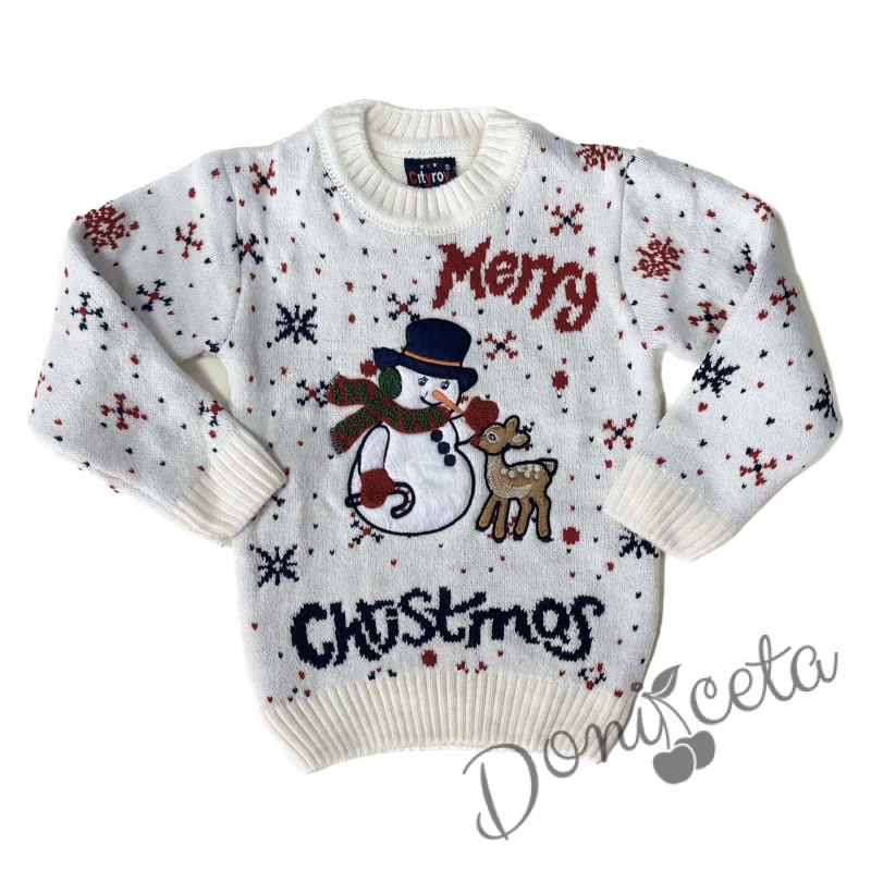 - Детски коледен пуловер в бяло с коледни мотиви със снежен човек и еленче.